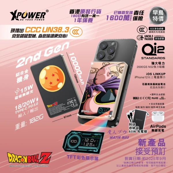 搶先評價 “(3C版)XPower x 龍珠Z MagDigita² 彩屏顯示鋁合金外殼 10000mAh PD3.0+QI2磁吸移動電源 (布歐)” 取消回覆